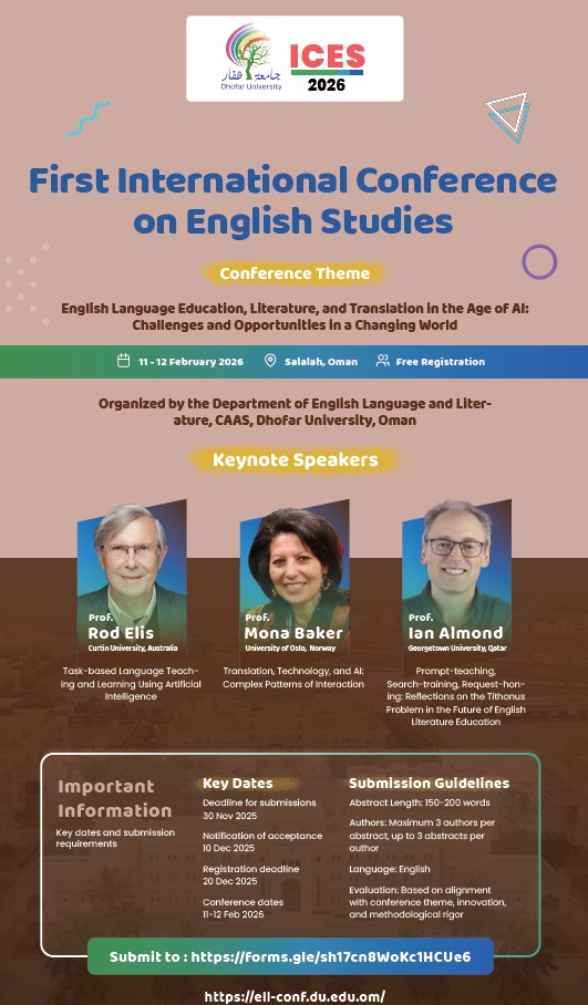 The Department of English Language and Literature, College of Arts and Applied Sciences at Dhofar University is pleased to announce the First International Conference on English Studies (ICES 2026), taking place in Salalah, Oman, on 11–12 February 2026.
